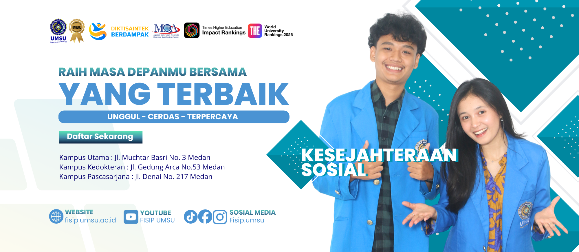 Kesejahteraan Sosial merupakan bidang studi yang mempelajari tentang cara untuk meningkatkan kualitas hidup masyarakat dan individu melalui pemberian bantuan sosial dan perlindungan sosial. Lulusan Kesejahteraan Sosial UMSU dapat menjadi pegawai pemerintah yang menangani program-program bantuan sosial, pekerja sosial, atau konsultan kesejahteraan sosial. Jurusan ini juga meliputi aspek teori dan praktik dari kesejahteraan sosial, termasuk perencanaan, pelaksanaan, dan evaluasi program sosial.
